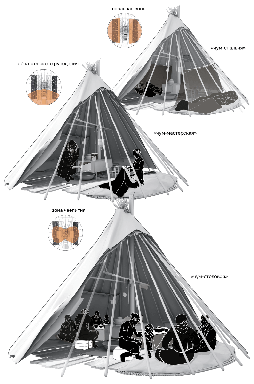 По обеим сторонам от очага располагаются спальные места (ва’ав). Каждый член семьи в зависимости от возраста и статуса (положения) занимает определенное спальное место. Глава семьи, его жена и младшие дети располагаются в центре ва’ав. Неженатые сыновья размещаются ближе к переднему углу, а незамужние дочери — ближе к двери. Ближний от середины к си-няӈы угол, самое почетное место, занимают старики. Другие брачные пары (женатые сыновья, братья или работники с семьями) проживают на противоположной половине чума. Обычно в чуме проживают одна-две семьи, каждая из них занимает свою половину. Гостей размещают, придерживаясь той же схемы: мужчины — от середины к священному углу, женщины — от середины к входу. Ситцевые полога (есер”) делят внутреннее пространство жилища на отдельные «спальные комнаты», а летом еще и защищают от гнуса. На день они свертываются в рулон и привязываются к шестам над постелью.