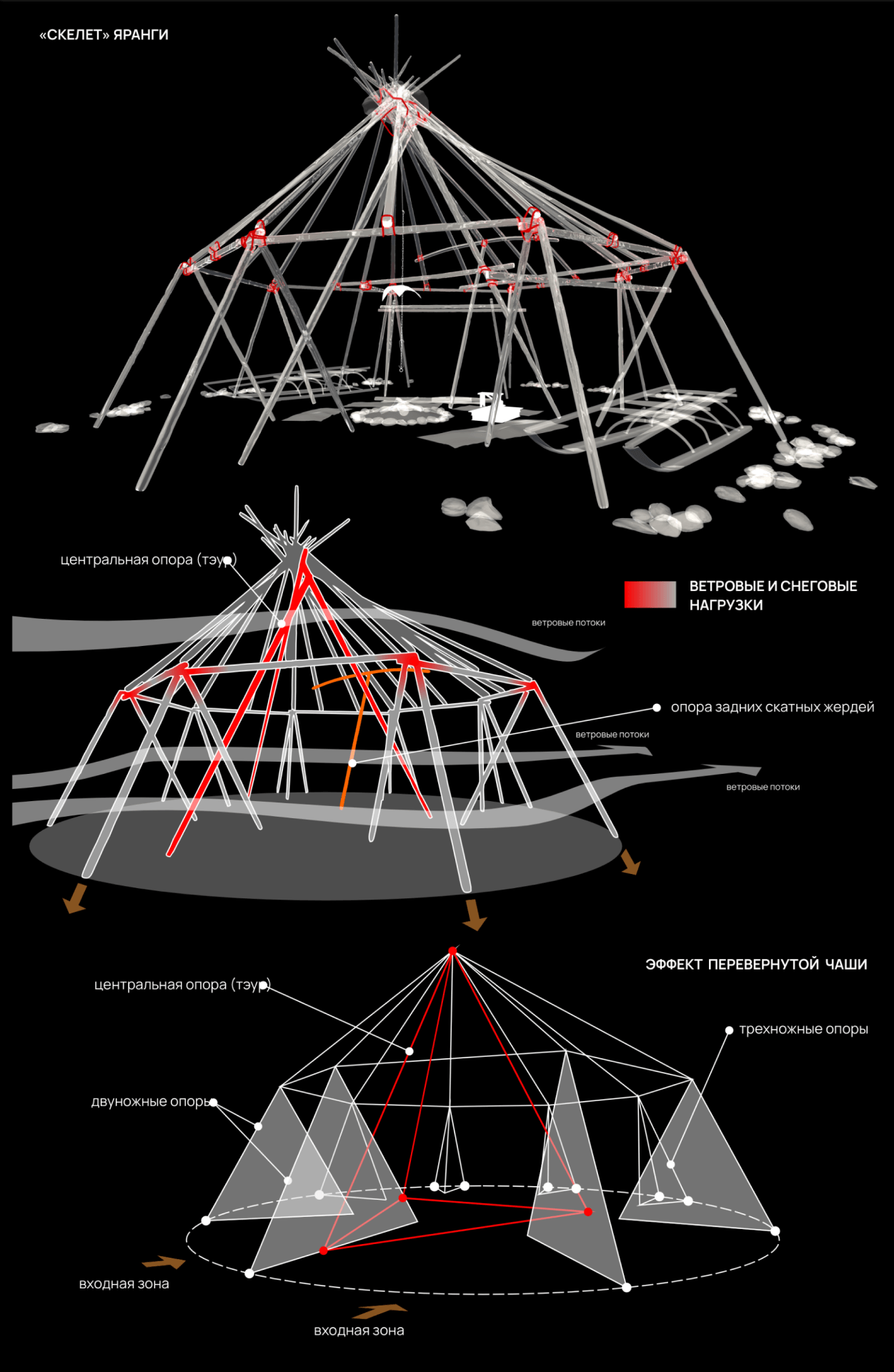 Яранга, как и чум, не подвергается снежным заносам. Во время сильных снежных бурь вокруг нее образуются ров и вал. Меховые ретэмы яранги и палатки собираются и сшиваются волосом вниз, что позволяет снегу и каплям дождя скатываться на землю, а не застревать в шкуре.