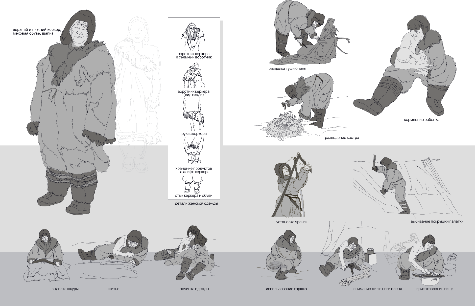 Для пошива женского нижнего керкера нужны три телячьих шкуры (пыжика), для верхнего — три шкуры оленя августовского забоя (подбор шкур происходит по высоте ворса и рисунку). На перед и спинку идут красивые (темные или пестрые) шкуры, на боковины — шкуры серого цвета.
