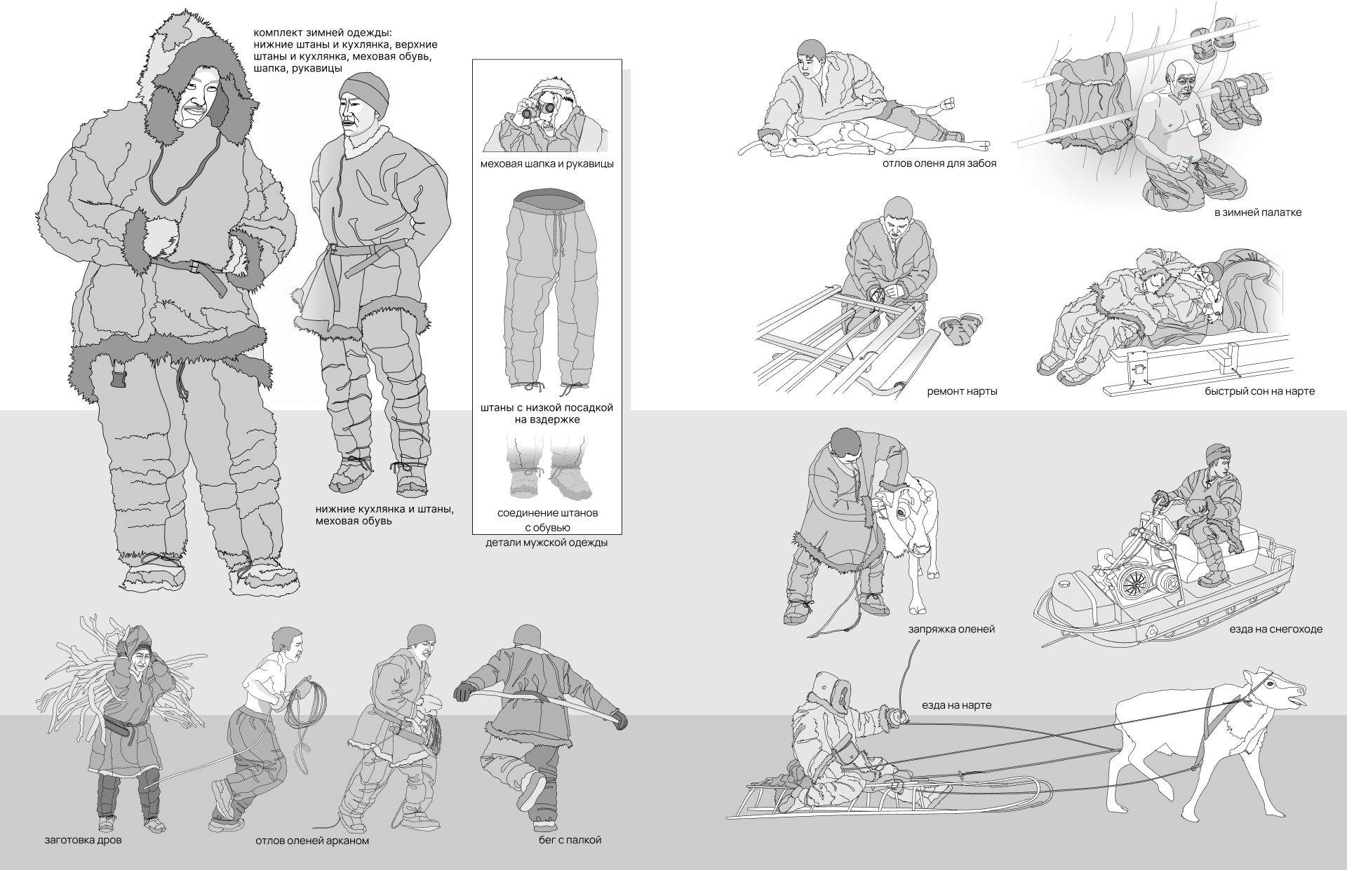 верхней кухлянки требуется 3–4 шкуры августовских телят или 2–3 летних шкуры взрослых оленей. Широкие проймы и рукава позволяют легко втянуть руки внутрь кухлянки. К вороту и разрезу горловины пришивают широкую полосу собачьего, волчьего, песцового меха, которая при