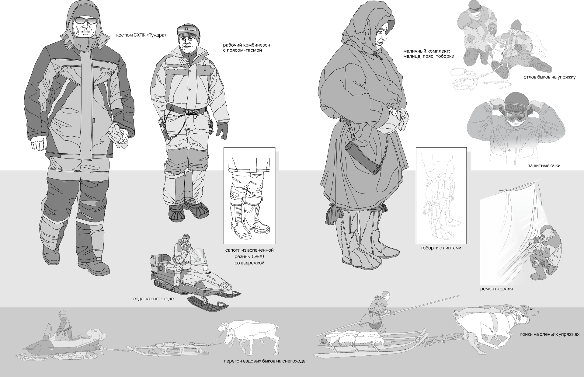 сапоги; над карманом куртки размещена нашивка-логотип кооператива — «СХПК “Тундра”. С. Ловозеро». Зимний костюм обходится в 3500–5000 руб., пара сапог — в 1200 руб. Зимнюю