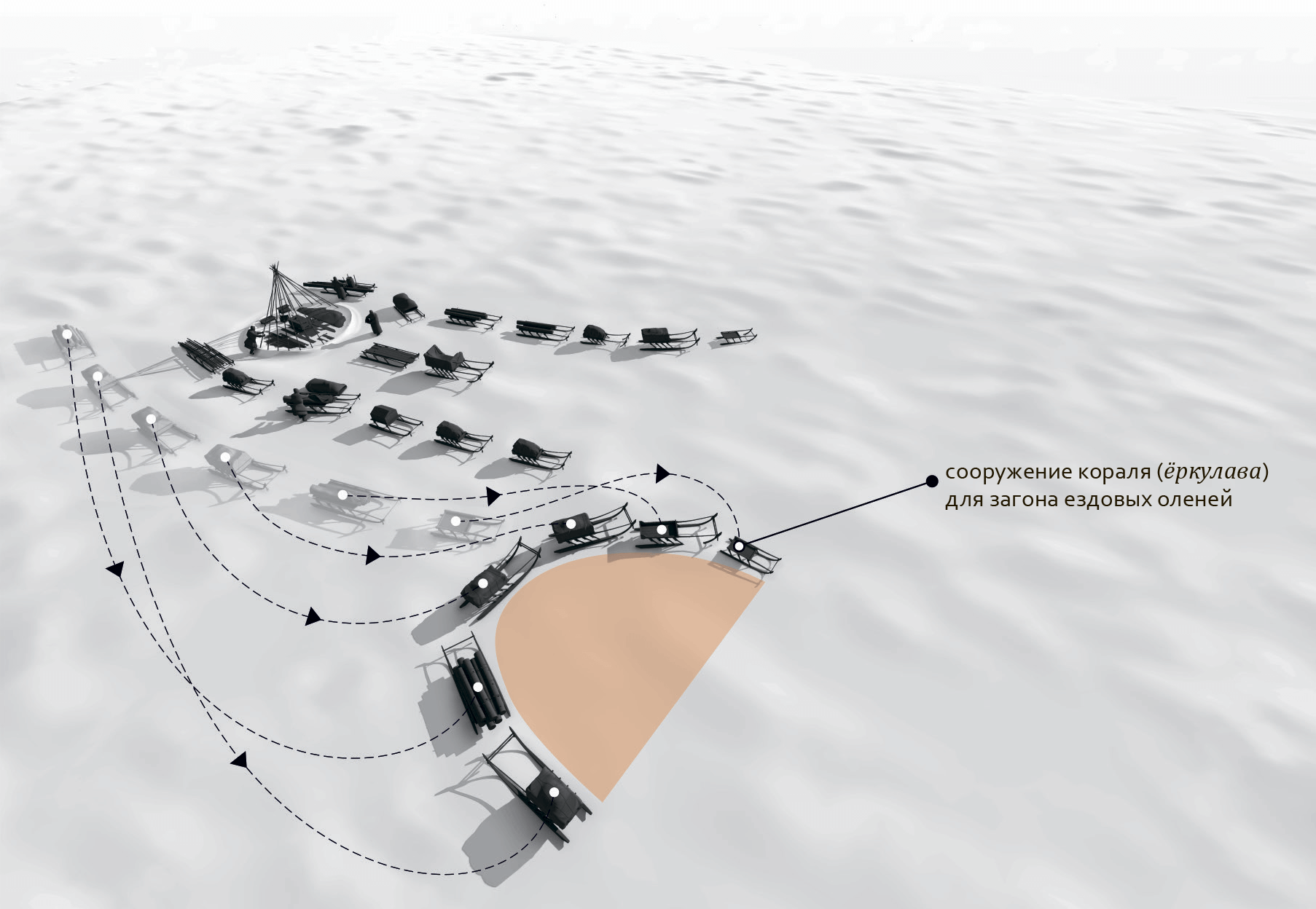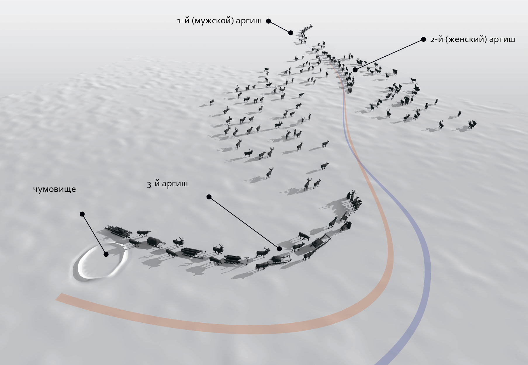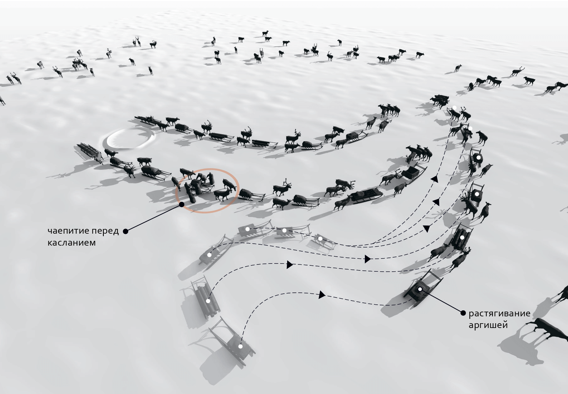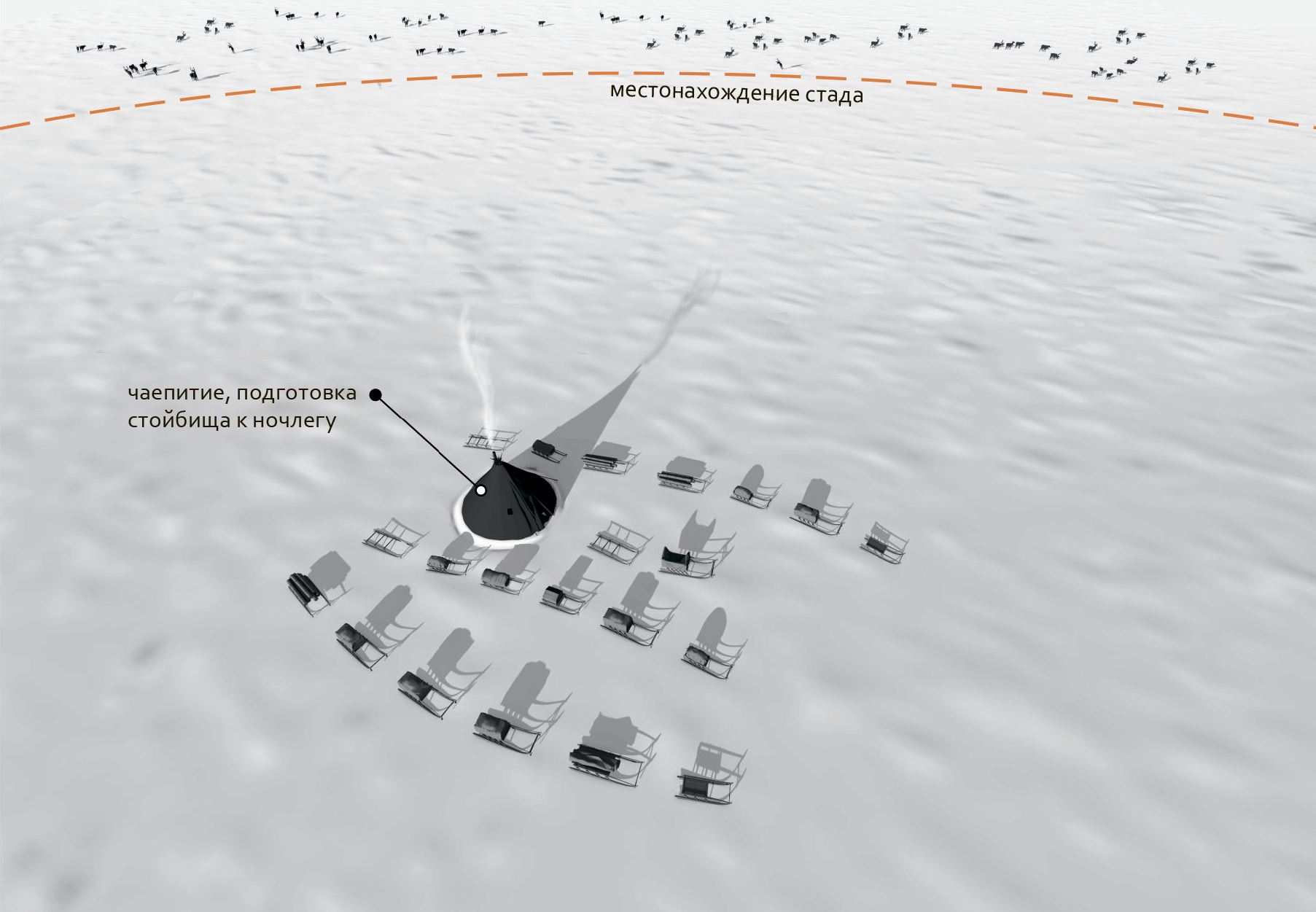 У стойбища, как и у аргиша, есть свой эластичный, но устойчивый шаблон: независимо от частоты постановки на новом месте (до 120 раз в течение года) и от особенностей ландшафта (или с незначительной поправкой на ландшафт), оно, будто по трафарету, приобретает привычный облик и упорядоченную структуру. Все чумы выстроены легкой дугой, обращены входами на восход; все нарты сгруппированы в определенном порядке вокруг своих чумов и обращены носами в ту же сторону. Этой структурой все ненецкие стойбища похожи друг на друга, и только сами ненцы способны сразу уловить особенности внутреннего устройства различных стойбищ. От такой упругости и повторяемости форм создается впечатление, что «архитектура» стойбища привязана не к конкретной местности, а к условной тундровой подоснове, и больше ориентирована на большое пространство, в котором важны координаты восход-закат, чем на локальную нишу, в которой значимы склоны и водоемы. Иначе говоря, для тундрового стойбища важнее его место в цепочке кочевого пути, чем в точечном локусе, и ненцы выбирают для стойбища место, максимально соответствующее заданному шаблону. Существенное значение для этого выбора (обычно повторяющегося на устойчивых маршрутах), помимо учета близости водоема, зарослей кустарника, ветрового и снежного режима, имеет обстановка взаимодействия людей и оленей: стойбище располагается на ровной возвышенной площадке для удобства обзора окрестностей и загона стада оленей (с учетом его величины).
