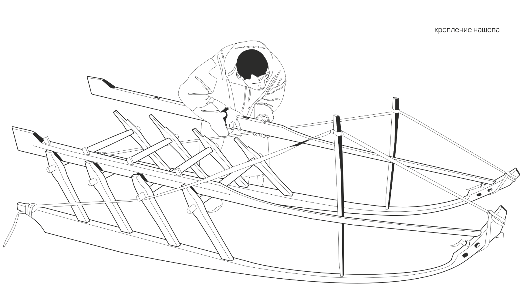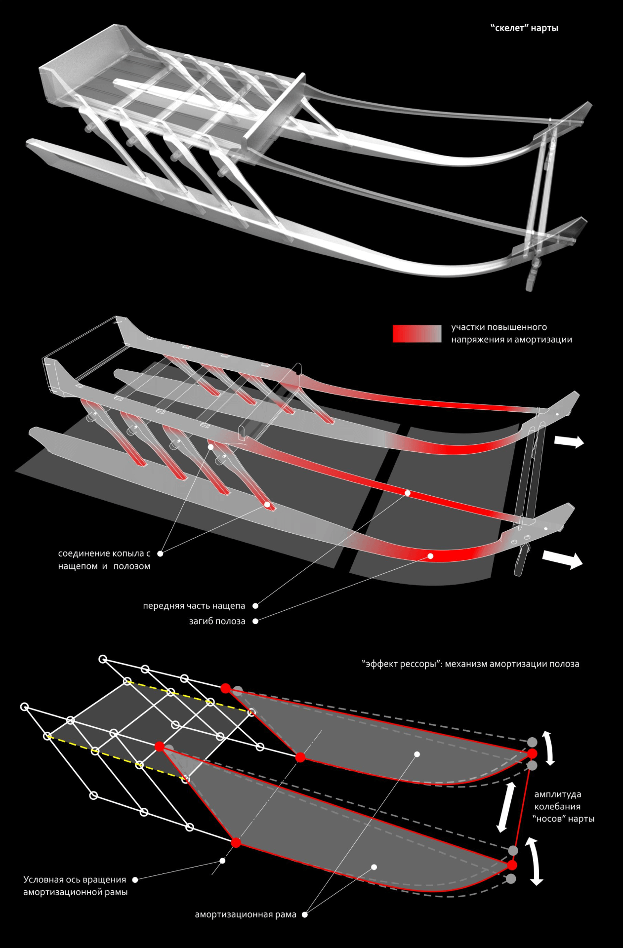 Принцип технической анимации (оживления) прослеживается и в изготовлении узлов нарты по «правилу скелета». Соединение частей и деталей нарт жесткое: на концах одних деталей выполняются четырехугольные «шипы», которые пригоняются в отверстия, сделанные с помощью сверла и ножа в соответствующих местах других частей. Все детали нарты выполнены из дерева и соединены с помощью деревянных «шипов», и ее крепость достигается за счет прочного «натурального» сращивания деталей. У нарты образуется скелет с сочлененными узлами, «носом», «ногами» и «хвостом». Тонконогая нарта не боится ни скорости, ни тяжести; она легко идет по снежным застругам, сугробам, болотам, крутым берегам, а при необходимости — пускается в плавание вслед за упряжкой оленей.